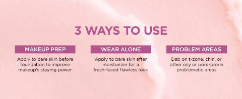- ПРАЙМЕР ДЛЯ ОБЛИЧЧЯ ТА КОНТУРУ ОЧЕЙ: Наноситься на чисту шкіру або після повного вбирання зволожувального крему. Нанесіть на контур очей для вирівнювання дрібних зморшок, на ніс та щоки для мінімізації видимості пор та недоліків, а на зону Т для матування