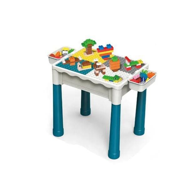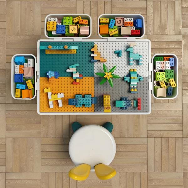 Стіл можна використовувати з обох боків, один бік призначений для складання блоків, а інший має рівну поверхню.