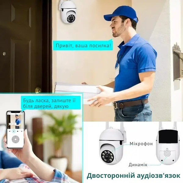Корисний вбудований мікрофон на зовнішній камері безпеки дозволяє вам говорити через наш додаток. Аудіо в обидві сторони дозволяє вам спілкуватися з людьми, а датчик руху допомагає позбутися небажаних осіб або тварин.