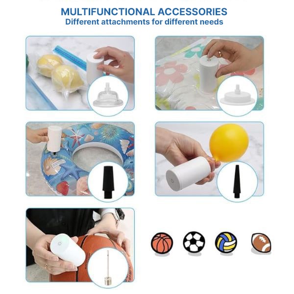 Більше, ніж просто вакуумний упаковщик! QUICKSEAL також працює як повітряний насос, що полегшує надування зберігальних пакетів, надувних басейнів, повітряних куль та навіть спортивних м’ячів з включеними насадками. Універсальний інструмент для дому, подорожей та щоденного використання!