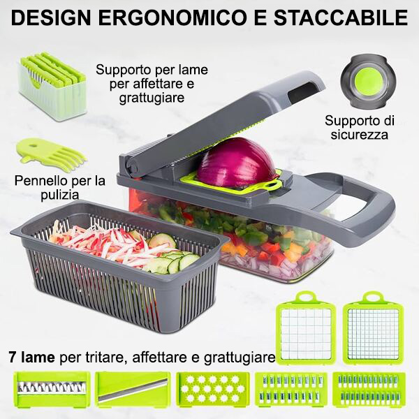 CHOPMASTER нарізає, ріже та терті овочі та фрукти за лічені секунди, роблячи підготовку їжі швидшою та без стресу. З набором з 7 змінних лез ви зможете швидко та без зусиль завершити роботу!