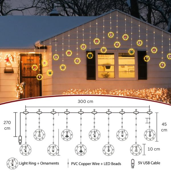 Ніжні мерехтливі вогні, ретельно розміщені всередині прозорих кілець, створюють чарівну атмосферу та випромінюють яскраве світло на підвішені статуетки.