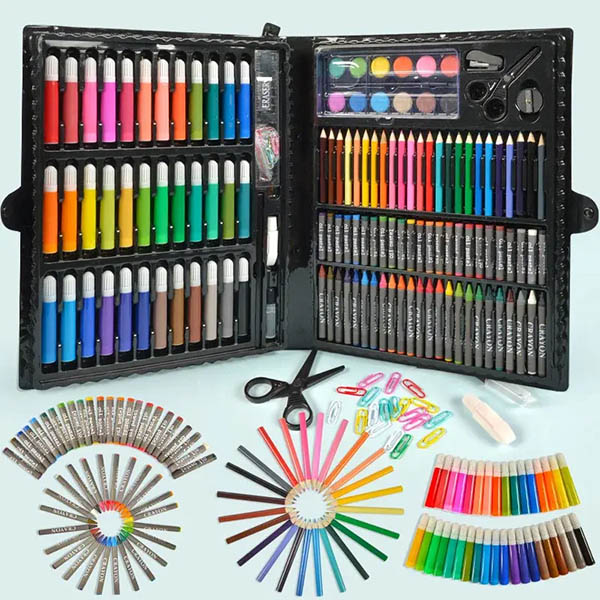 Включає олівці, лінійку, фломастери, акварельні фарби та точилку — ідеально для шкільних проектів, уроків малювання або вільного часу.